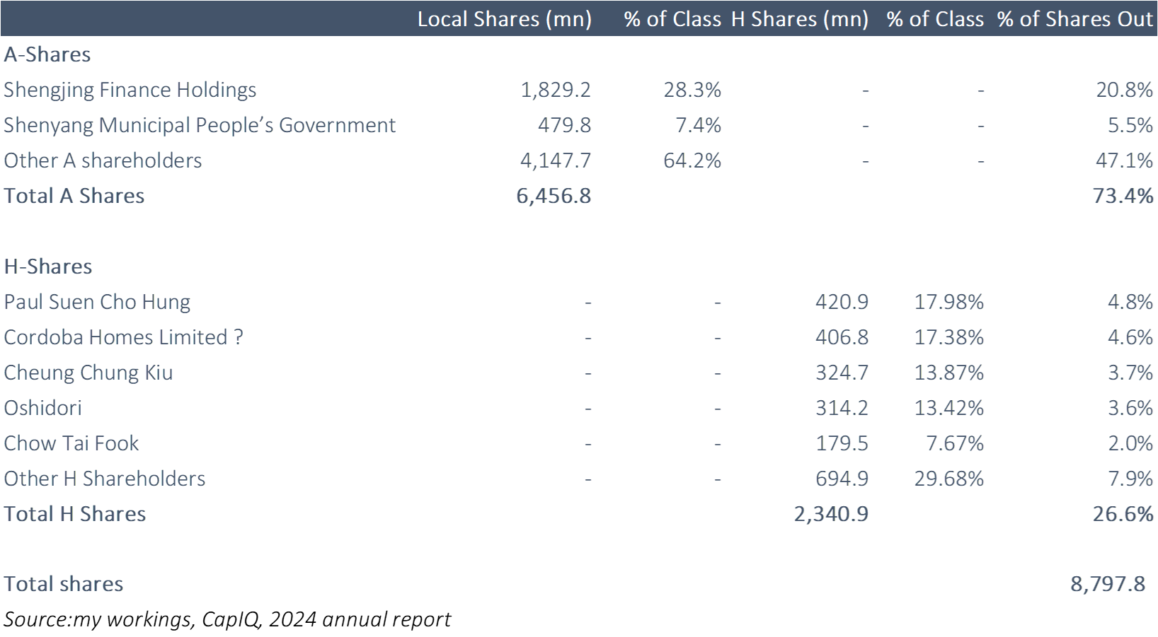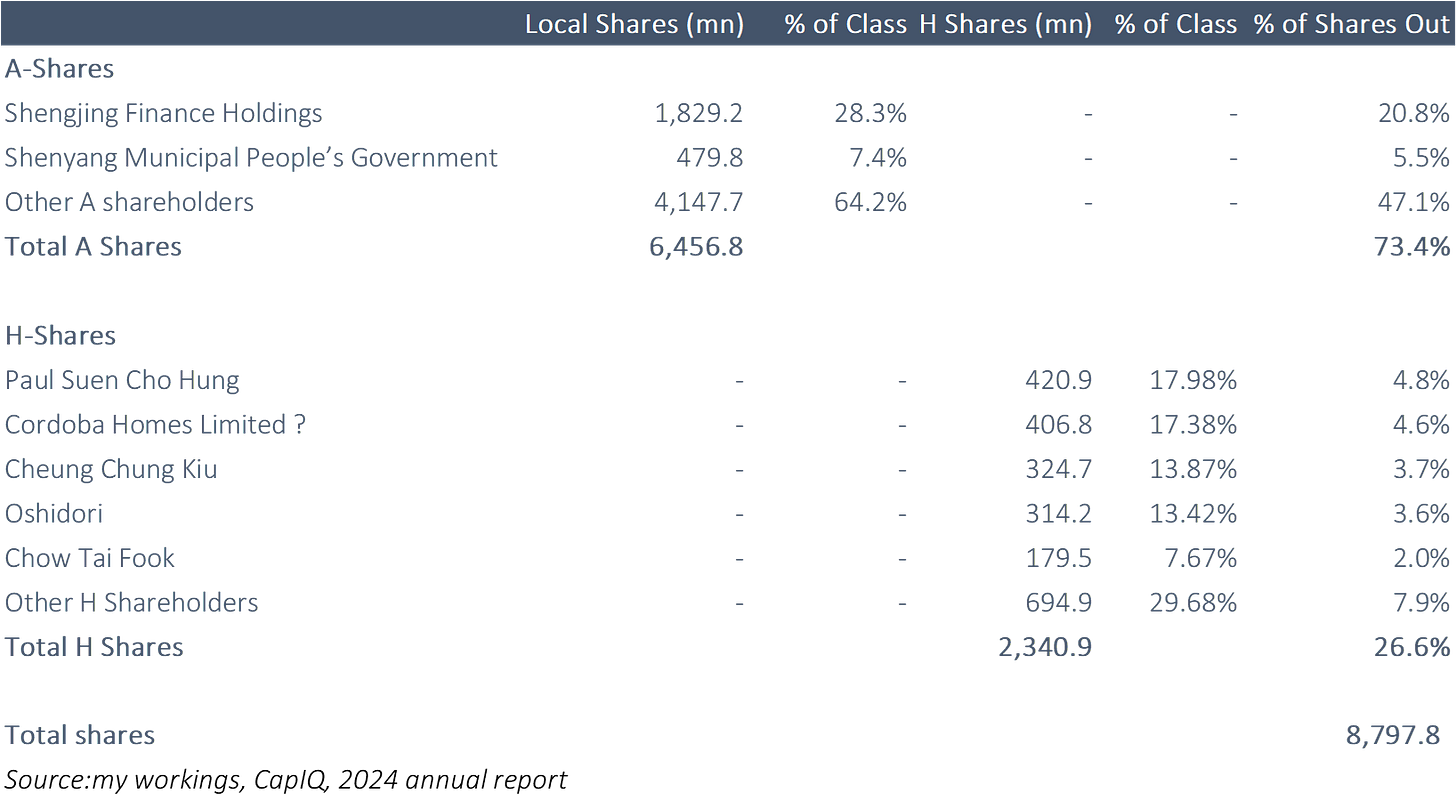Who owns what? Shengjing Bank is primarily owned by state-owned entities and institutional investors via the A shares.